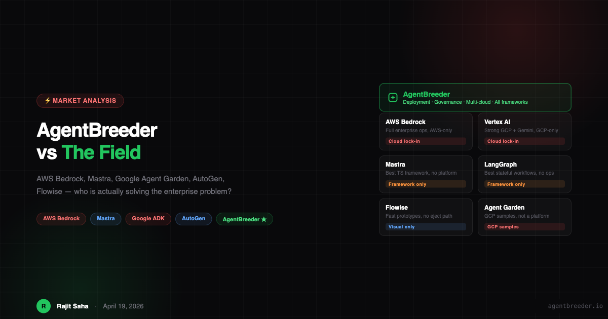Rajit Saha is the founder of AgentBreeder. The comparisons in this post reflect capability scope as of April 2026 — all frameworks and platforms are evolving rapidly.